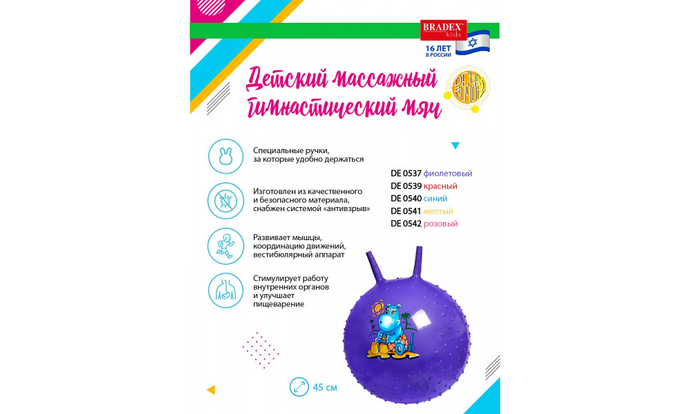Детский мяч-попрыгун предназначен не только для активных игр и веселья, но и для выполнения гимнастических и лечебно-профилактических упражнений. Занятия с массажным мячом улучшают осанку, укрепляют мышцы ног, рук, спины, брюшного пресса, и всего мышечного корсета. Гимнастический мяч-попрыгун оснащен двумя ручками, за которые удобно держаться во время прыжков или использовать как стопор при выполнении упражнений. Мяч-прыгун с ручками-рожками специально разработан для проведения ЛФК, программ детского фитнеса, а также для домашнего использования. Преимущества: ● Способствует снятию мышечного тонуса. ● Развивает мышцы. ● Стимулирует работу внутренних органов и улучшает пищеварение. ● Тренирует координацию и вестибулярный аппарат.